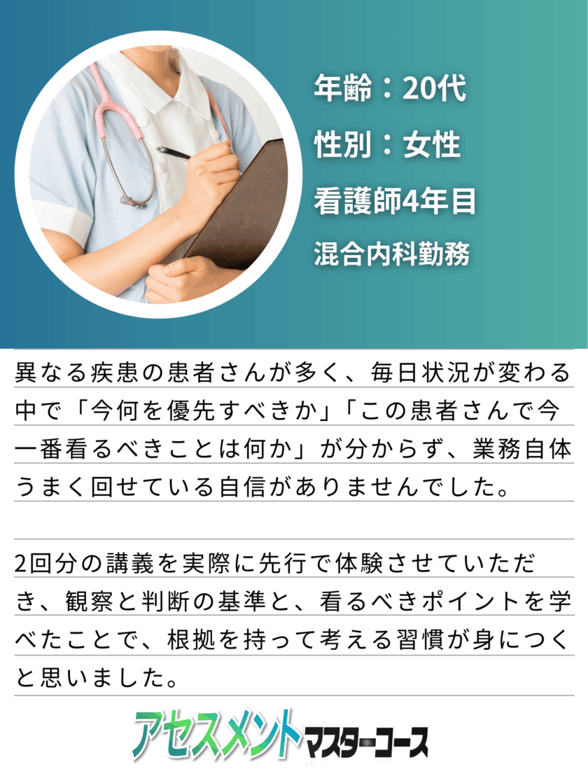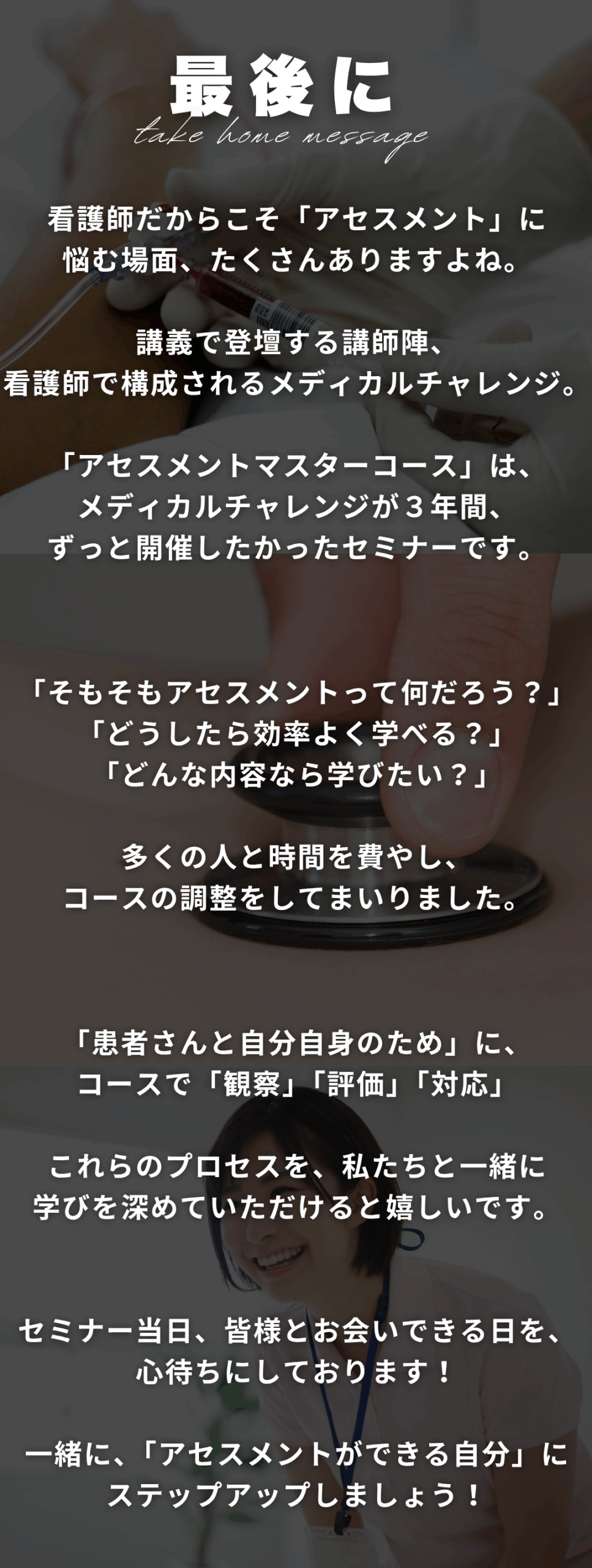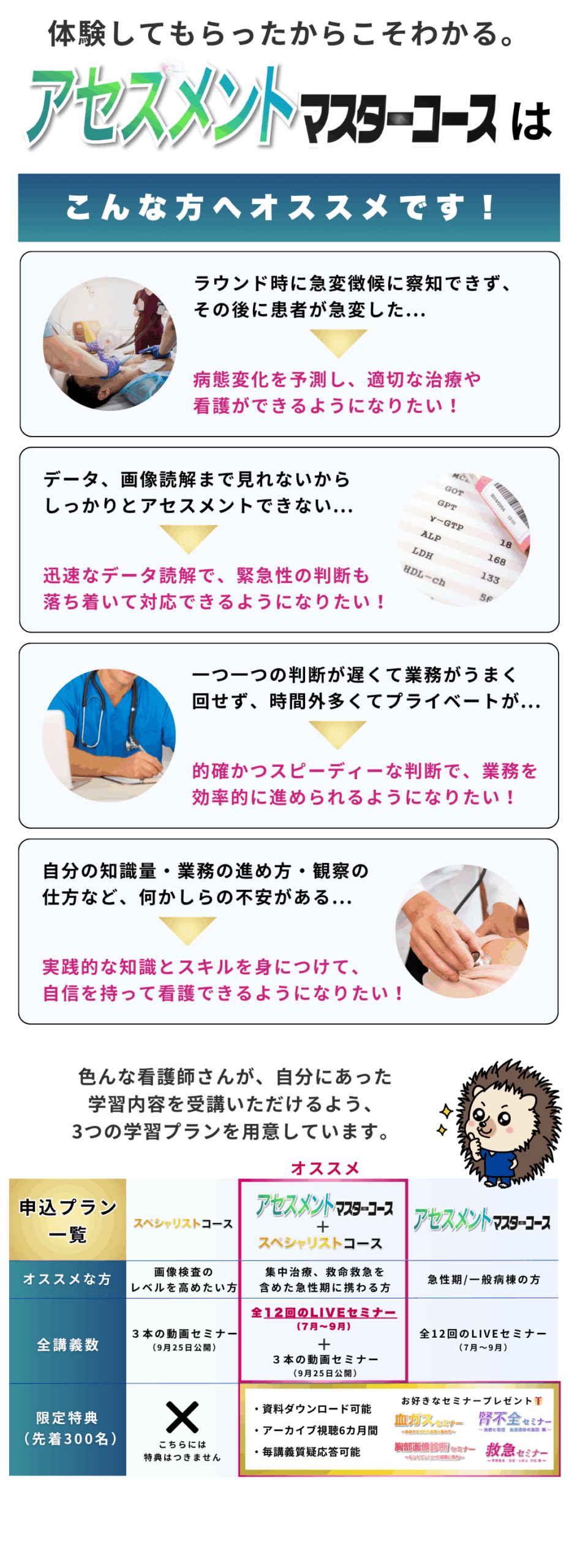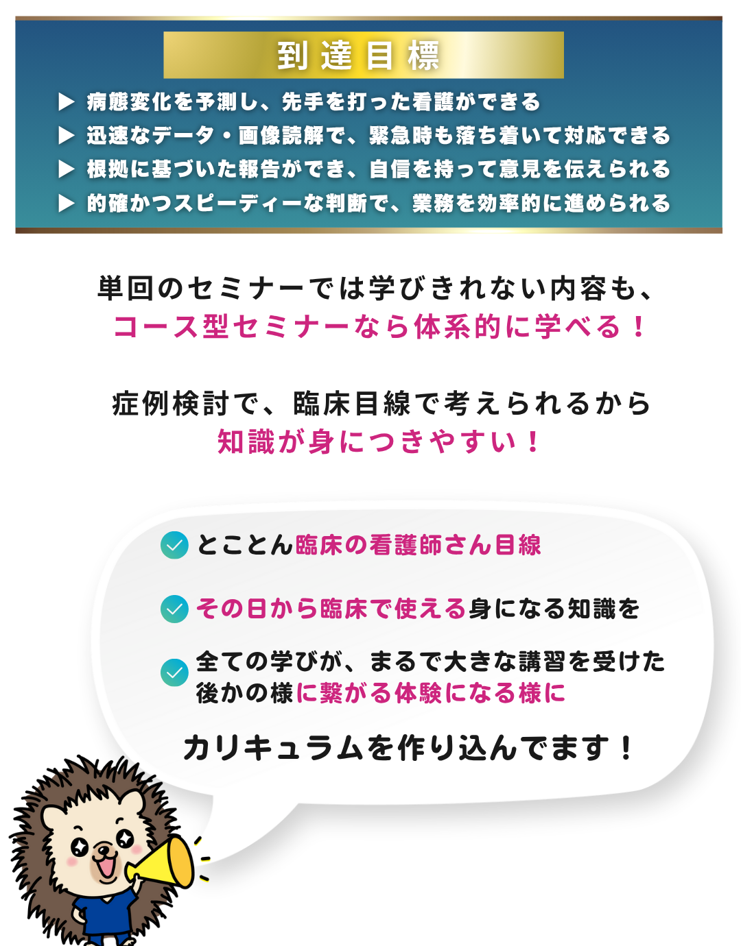 また、今までのコースセミナーでも、看護師以外に学生や他職種の医療職者など多数参加いただいておりますので、お気軽にご参加ください。